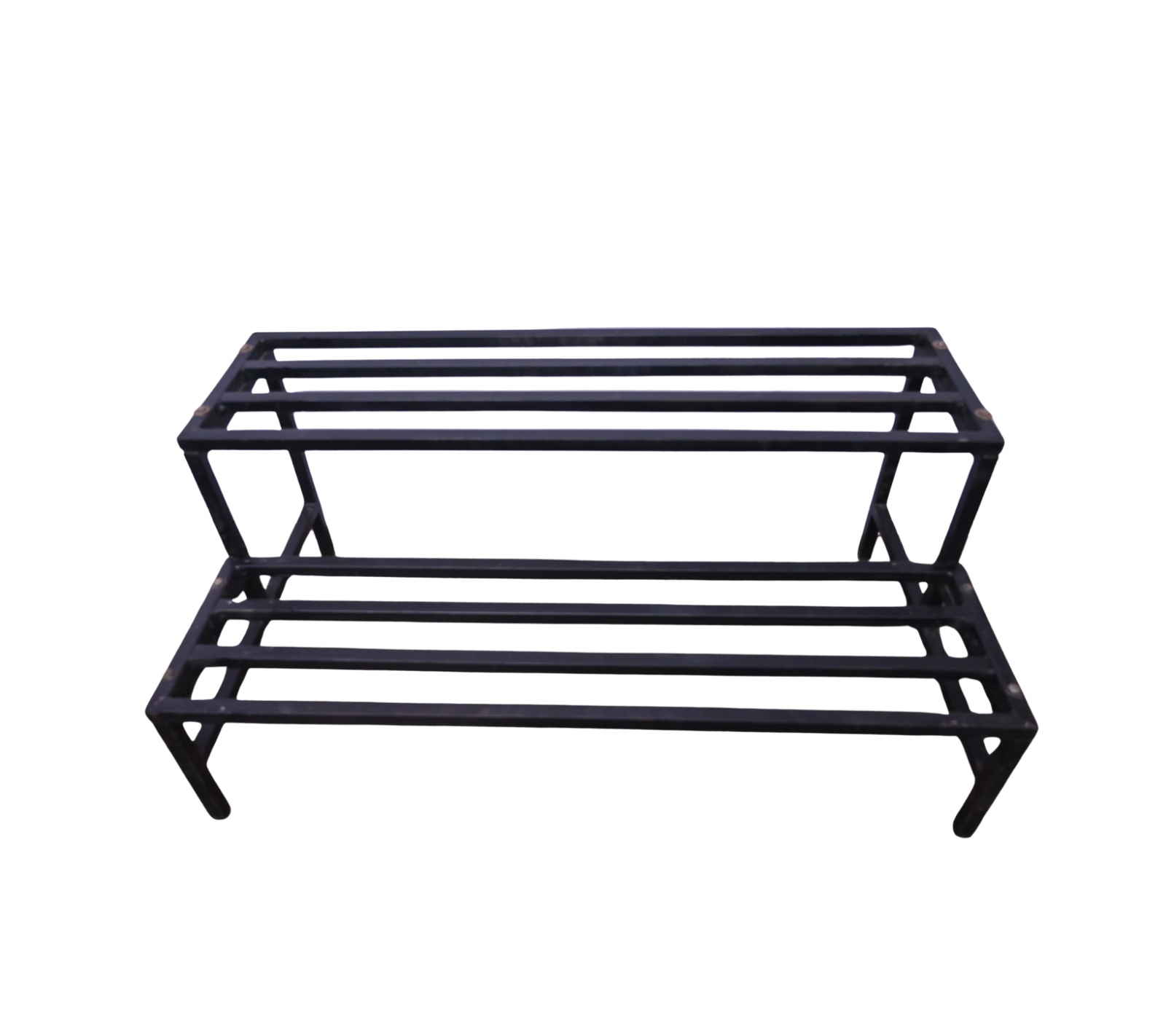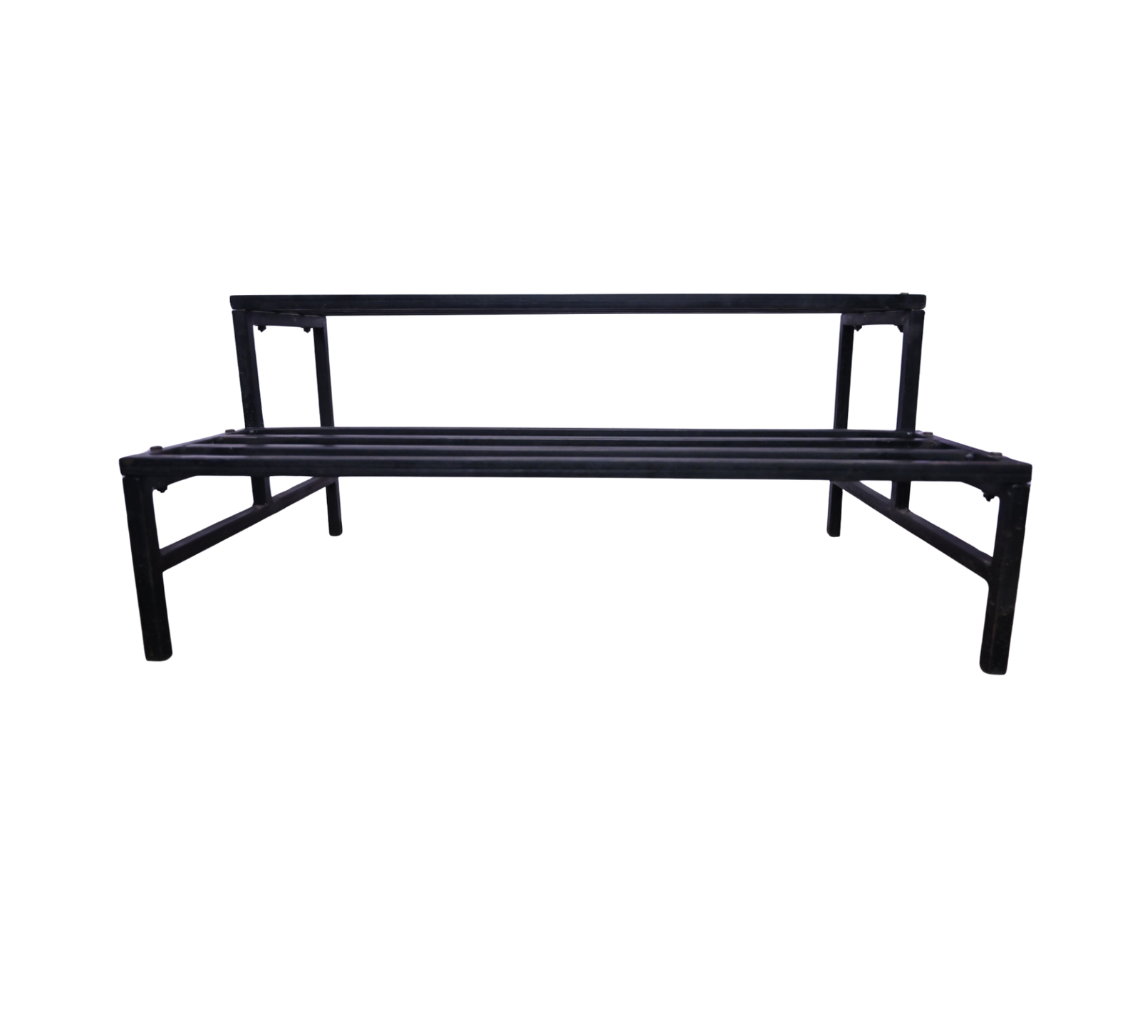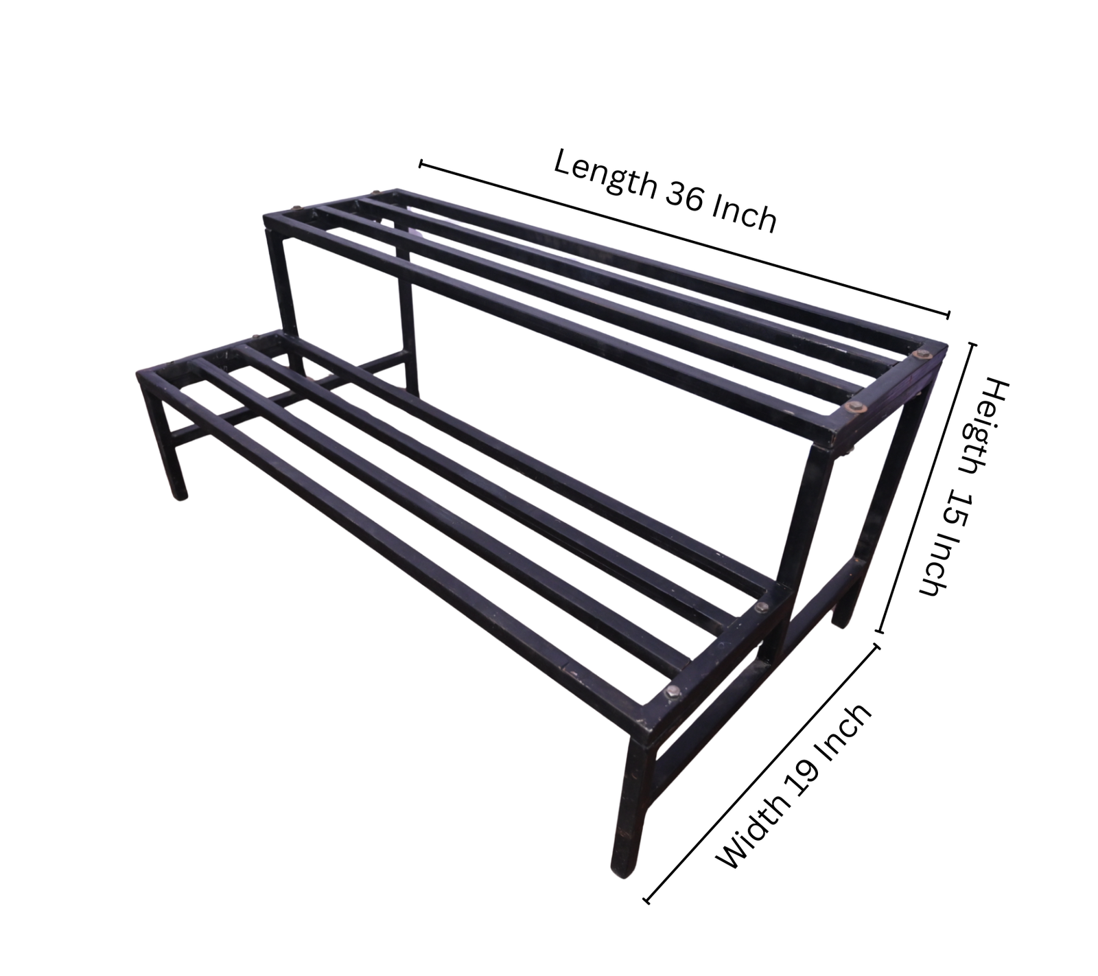 The two-level design allows better spacing, improved airflow, and optimal sunlight exposure for plants. Its solid welded structure ensures excellent stability, even when loaded with heavy cement or ceramic pots. The black powder-coated finish provides resistance against rust and corrosion while giving a clean, modern appearance.